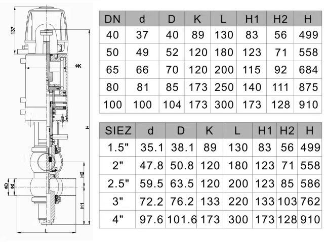 工作原理: 1、双座双密封结构:阀门内部设有两个独立的阀塞(或柱塞)和对应的密封件。 当阀门处于关闭状态时,这两个密封件分别阻断两侧的流体通道。 2、泄漏腔(排放腔):在两个密封件之间,形成了一个被称为泄漏腔或排放腔的空间。 这个腔室通常与大气相通或设有专用出口。 3、防混保障机制:在极其罕见的情况下,如果其中一个密封失效发生泄漏,泄漏的物料会流入这个中间的泄漏腔,并通过设计好的泄漏出口排出,而不是流入另一侧的管道,从而从根本上避免了两种介质的直接混合。 4、操作与控制:防混阀通常为常闭(NC)型阀门,通过压缩空气驱动的气动执行器进行远程控制。 在需要流体通过时,阀塞提升,打开通道;在清洗(CIP)或灭菌(SIP)周期中,阀门也参与流程控制以确保卫生。